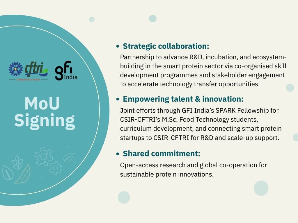The Good Food Institute India has signed an MoU with CSIR−Central Food Technological Research Institute (CFTRI), a premier food research institution, to expedite smart protein innovation in India.
