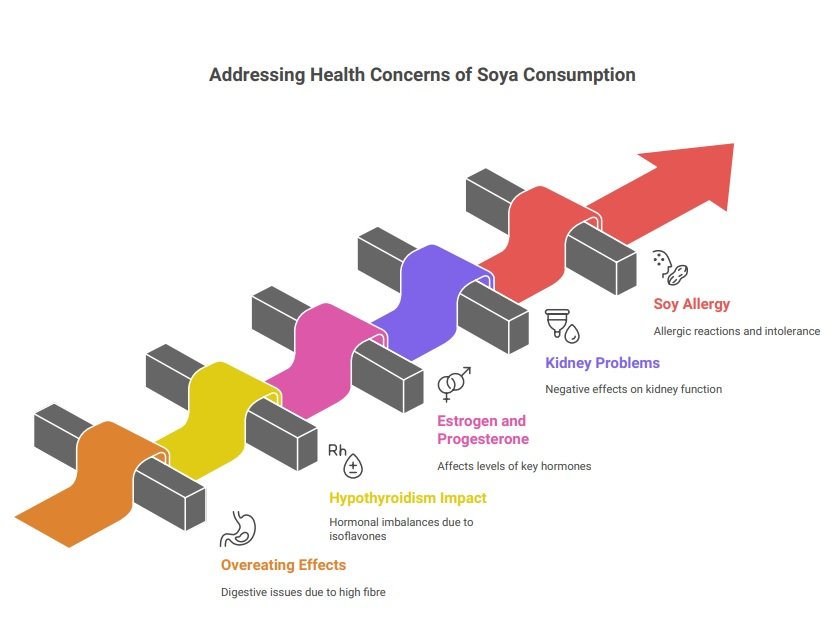 Despite a host of healthy benefits and being easily available in the market at an affordable price, hidden health issues have been reported. Overeating can lead to digestive issues due to the soya’s high fibre content and compounds like oligosaccharides. Individuals with hypothyroidism can have hormonal imbalances due to soy isoflavones. Apart from hormonal issues, such as health issues, where the levels of estrogen and progesterone have been reported. Reports of the kidney being affected have also been reported. Soya allergy and soya intolerance can be some of the major health issues.