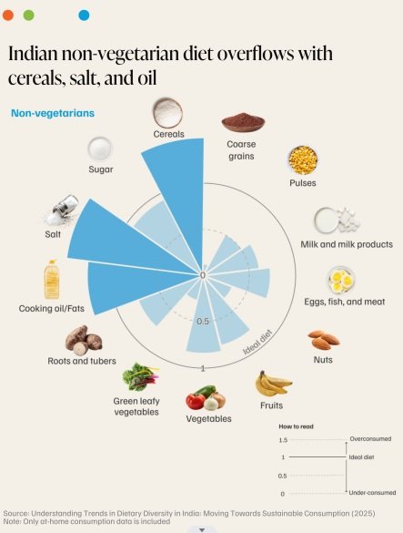 While Indians consume an adequate average of 55.6 g of protein per day at home, the study finds that cereals alone supply nearly 50 per cent of this protein despite their low-quality amino acid profile and poor digestibility. This contribution of cereals to protein intake is far above the NIN-recommended 32 per cent, crowding out higher-quality protein sources such as pulses, dairy and eggs/fish/meat. Protein supports the body’s growth, repair, and immune function. The CEEW study further finds under-consumption across major food groups, such as vegetables, fruits, and pulses, and overuse in cooking oil, salt, and sugar intake.