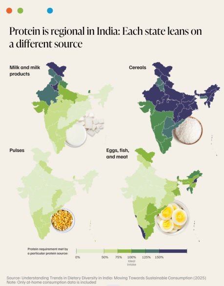 Nearly half of India’s at-home protein intake now comes from cereals such as rice, wheat, suji, and maida, according to a new, independent study by the Council on Energy, Environment and Water (CEEW). The study analyses Indian dietary trends based on the latest 2023-24 NSSO Household Consumption Expenditure Survey (HCES) dataset.