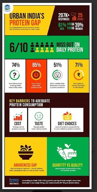 The survey found that 6 out of 10 urban Indians surveyed are not consuming protein-rich foods daily, while only 4 in 10 urban Indians (out of the total 18,352 respondents) include protein-rich foods like lentils, eggs, milk, paneer, fish, or nuts in their everyday meals. This gap shows that despite rising health consciousness, protein still doesn’t have a consistent place in most Indian diets. In addition, nearly three-fourths of respondents could not correctly identify the daily protein requirement for an average adult (the ICMR recommends average daily protein consumption of 0.66 to 0.83 grams per kilogram of body weight for healthy Indian adults). The data points to a significant knowledge gap even among health-aware urban consumers.