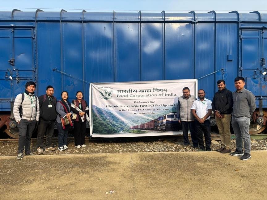 In a significant historic milestone, the first-ever Food Corporation of India (FCI) food grain cargo train arrived at Sairang Railway Station on March 3, 2026. The cargo train comprised 42 wagons carrying around 25,900 quintals of rice from Punjab. This marks an important step in strengthening rail-based freight connectivity in the state and improving the supply chain of essential commodities. The successful unloading of the inward FCI food grain rake at Sairang signifies the growing operational capability of the station and highlights the expanding role of railway infrastructure in supporting Mizoram’s logistics and food distribution network.